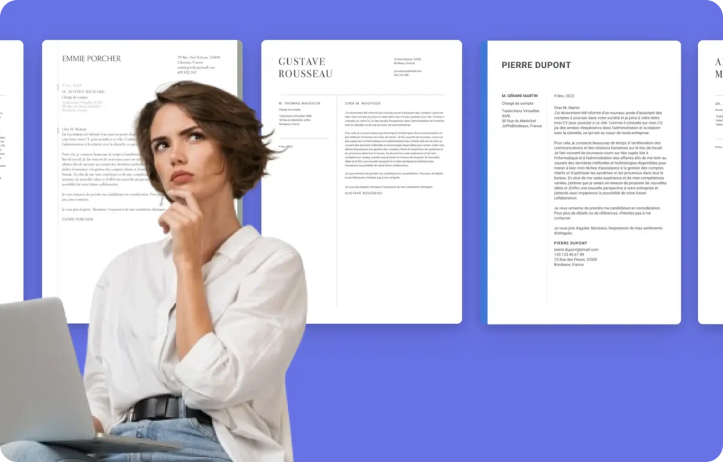 Vous avez le syndrome de la page blanche ? Vous ne savez pas par où commencer ? Utilisez notre créateur de lettre de motivation IA pour obtenir un texte qui reflète vos expériences, vos compétences et votre personnalité en seulement quelques minutes.