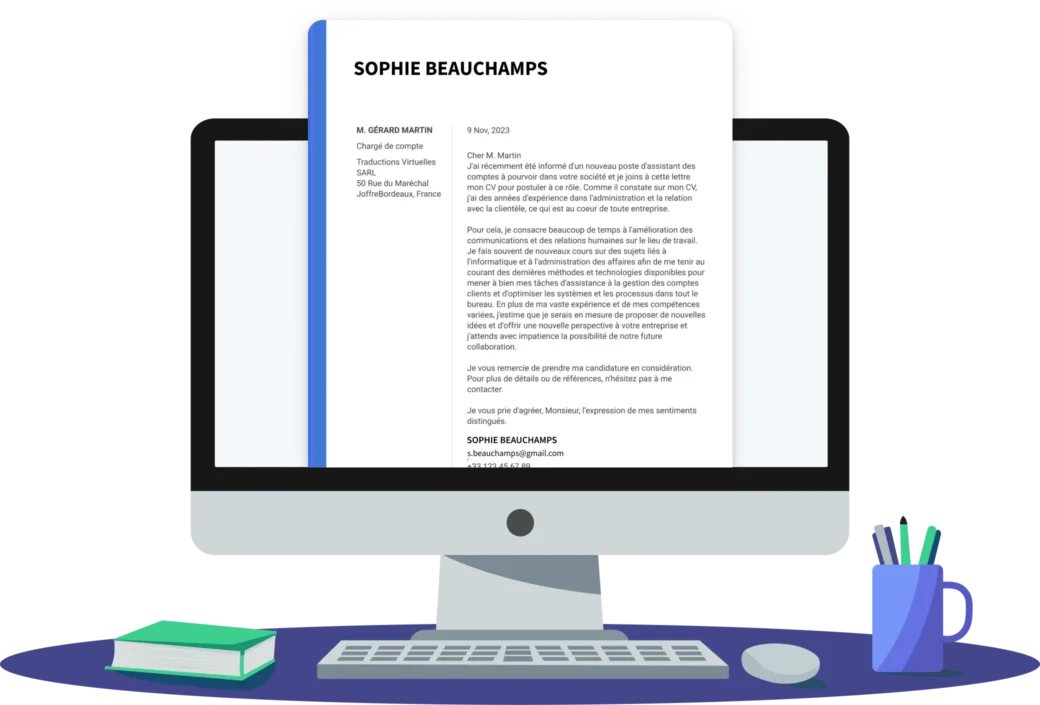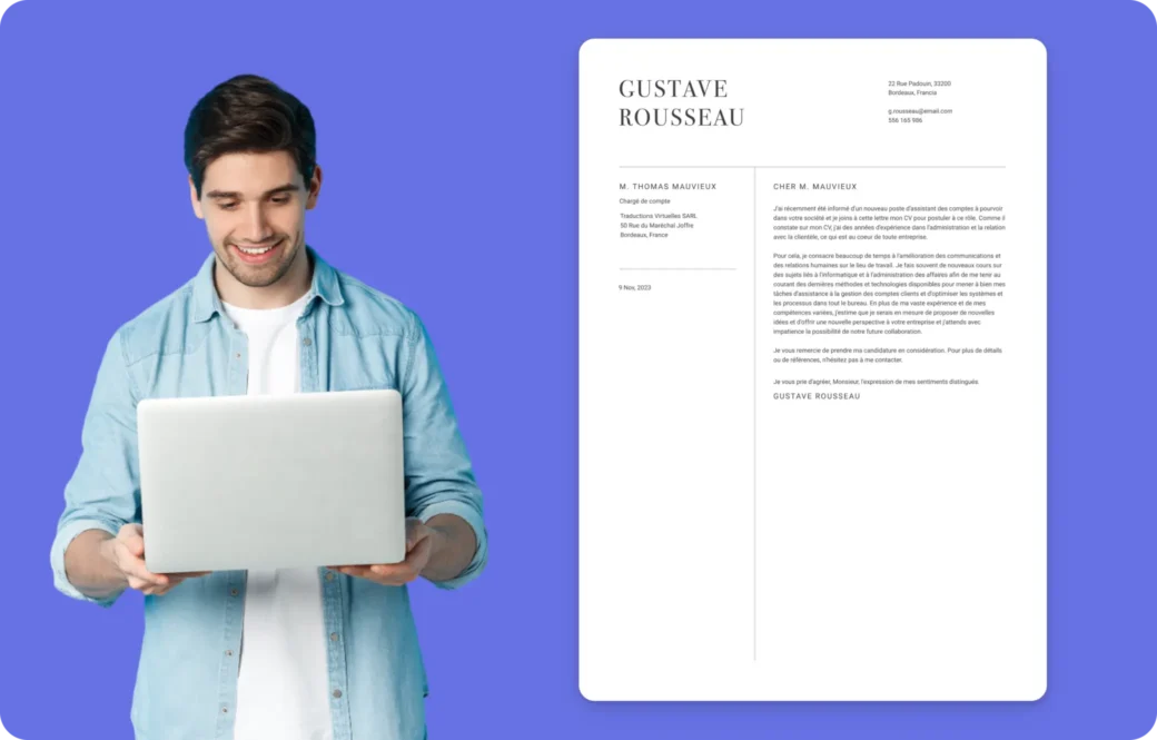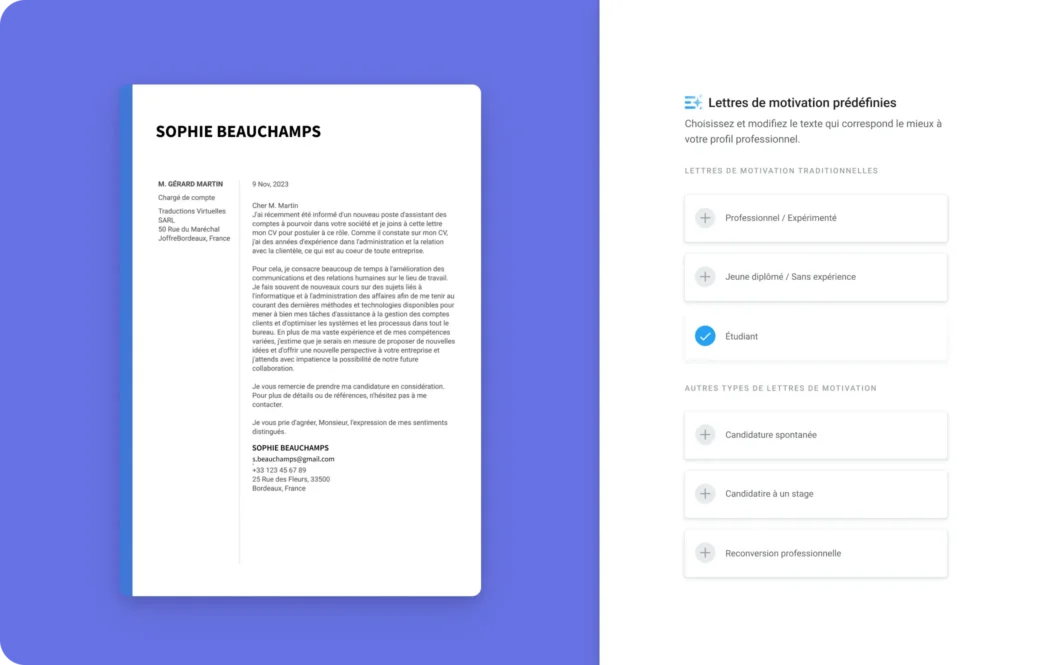 Grâce à notre créateur en ligne, vous pouvez générer des lettres de motivation adaptées à chacune de vos candidatures. Jetez un œil à tous nos avantages.