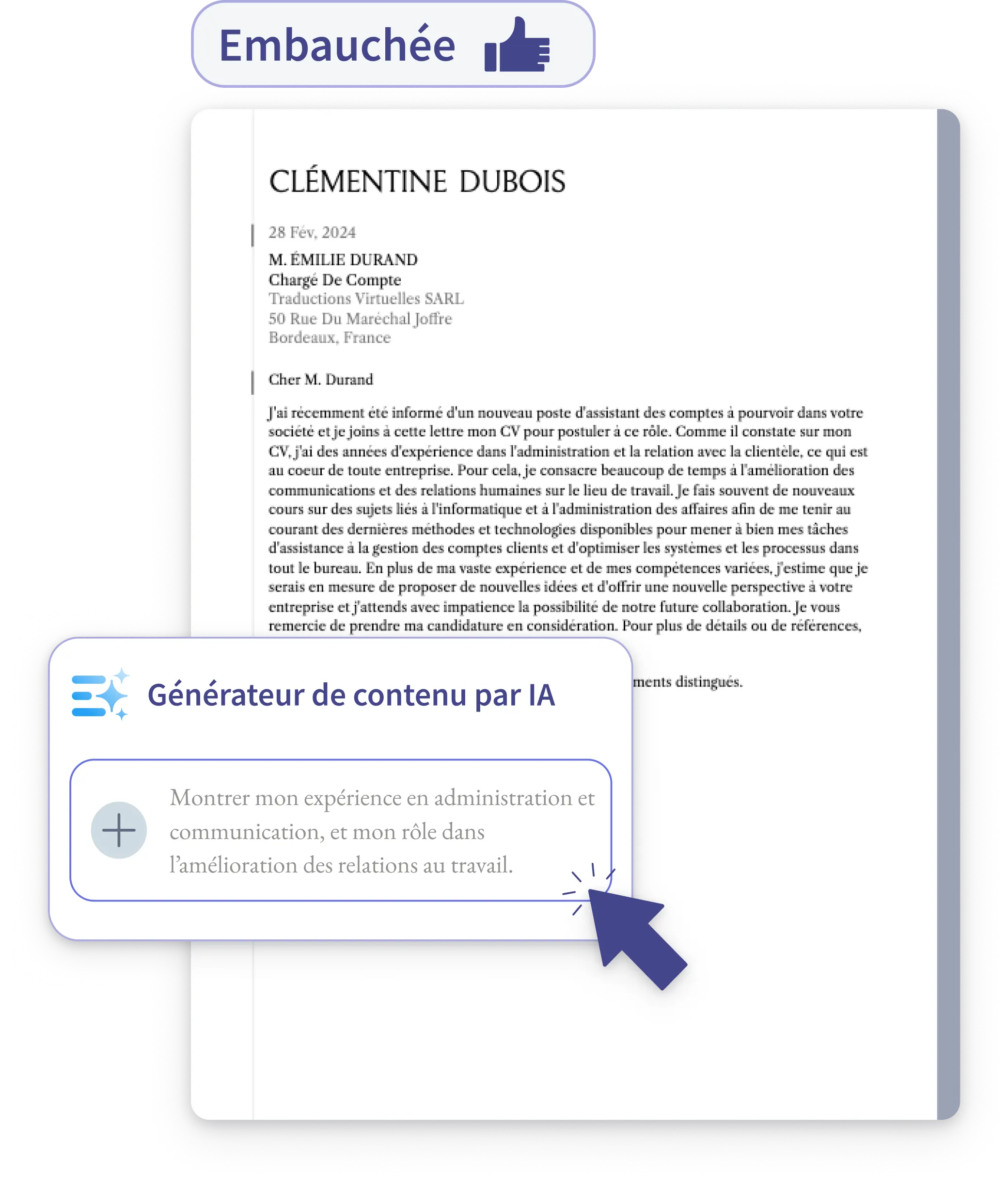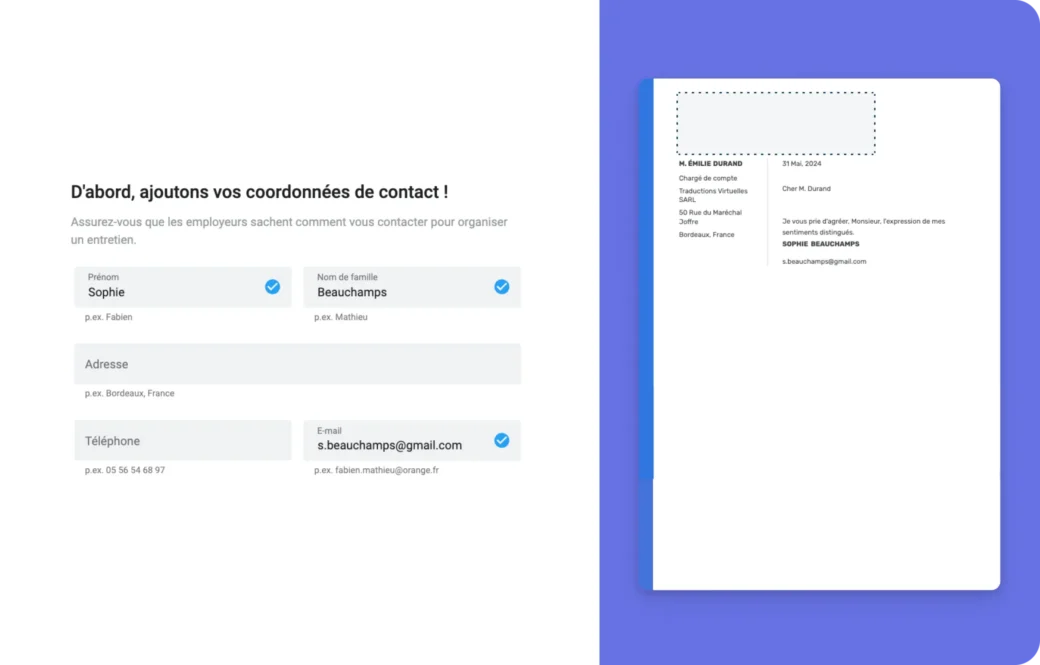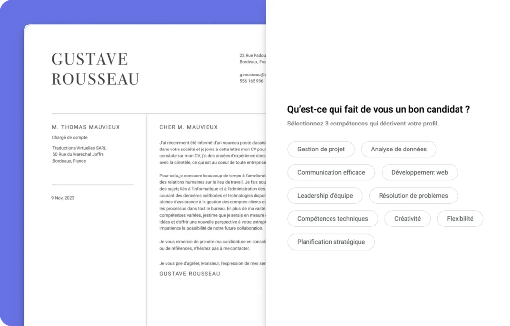 Indiquez l’entreprise et le poste visés, vos années d’expérience, vos compétences principales, vos coordonnées et l’intelligence artificielle se charge du reste !